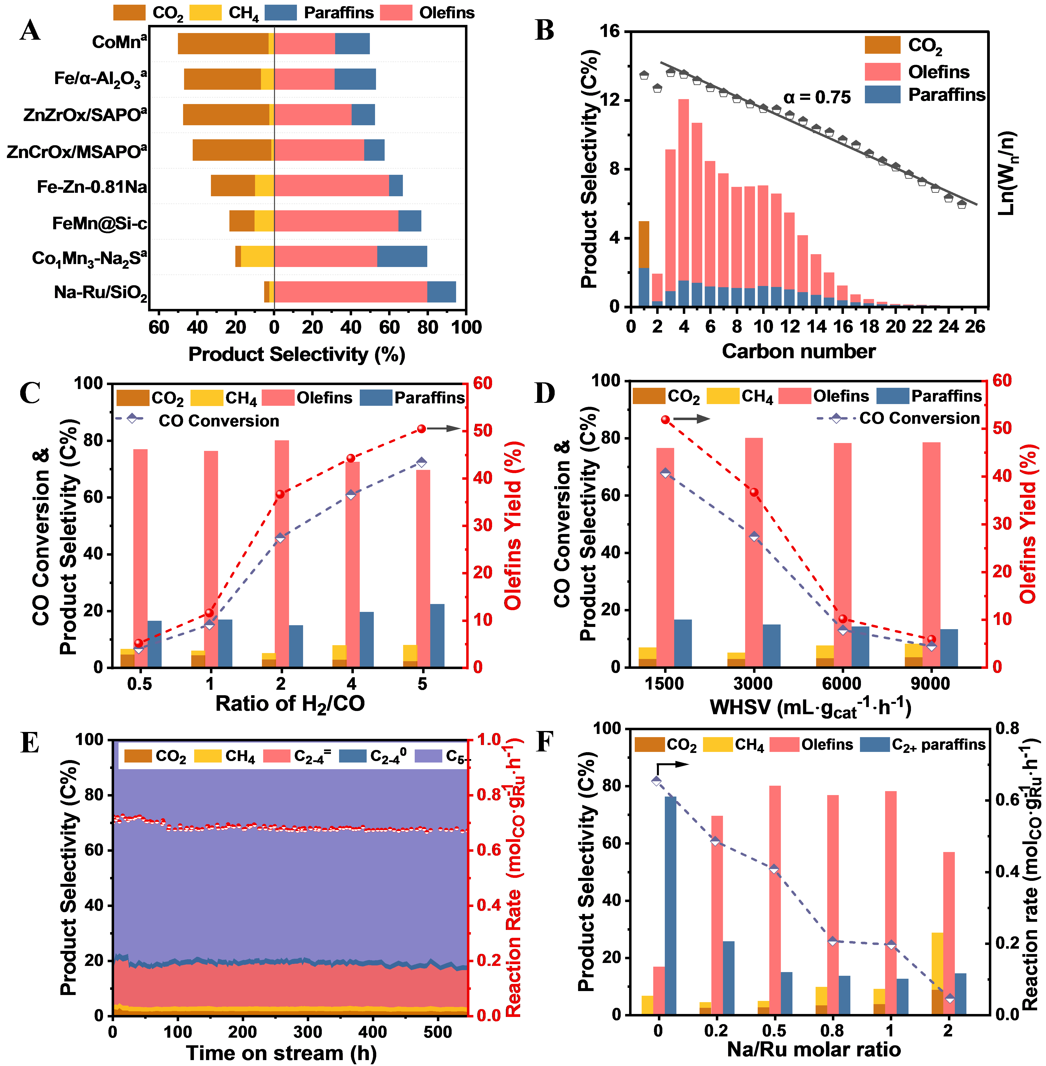 在此背景下,该研究团队开发了碱金属改性Ru基催化剂并应用于合成气经费托路线直接转化制备烯烃,改性Ru基催化剂表现出优异的FTO催化性能,在45.8%的CO转化率下烯烃选择性可高达80.1%,同时CH4和CO2总选择性小于5%,体现出极高的碳效(图1)。所得烯烃集中在C20以内,74.5%属于C5+长链α-烯烃。更为显著的是,该催化剂可用于很宽氢碳比范围的合成气(0.5~5),适用于几乎所有含碳资源(煤、天然气、生物质、固体废弃物、CO2等)得到的合成气。与现有所报道的合成气制烯烃的催化体系相比,改性Ru基催化剂体现出最低的C1副产物选择性,最高的总烯烃选择性和收率,且烯烃收率突破50%。显然,改性Ru基FTO催化剂的催化性能有别于传统的以饱和烷烃为主的Ru基费托催化剂。