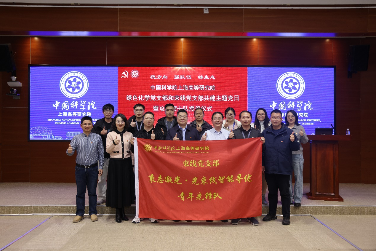 在热烈的掌声中,党委书记陈丰伟为绿色化学团支部和束线团支部颁发“四强·五星”团支部奖牌,并向“烷基萘中试生产攻坚突击队”和“秉志凝光·光束线智能寻优青年先锋队”两支攻关突击队授旗。